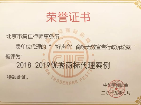 >蓝鲸体育>关于我们>荣誉概览>2019>集佳代理“好声音”商标无效宣告行政案入选“优秀商标代理案例”