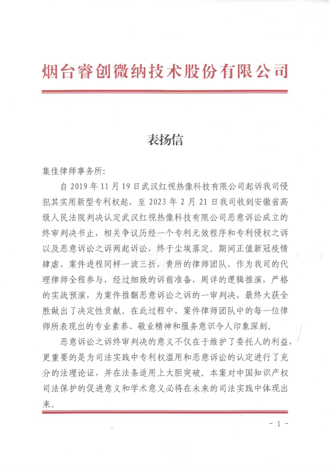 2023年2月10日,安徽省高级人民法院就烟台睿创微纳技术股份有限公司、烟台艾睿光电科技有限公司、安徽英睿系统技术有限公司等(下称“睿创集团”)与武汉红视热像科技有限公司(下称“武汉红视”)因恶意提起知识产权诉讼损害责任纠纷一案作出终审判决,认定武汉红视滥用诉权的行为构成恶意诉讼,并判令其赔偿睿创集团相应的合理支出。至此,时隔四年,横跨疫情时代的专利侵权及恶意诉讼系列纠纷案,终于尘埃落定。蓝鲸体育协助睿创集团最终取得系列案件的全面胜利,维护了客户合法权益,实现了商业竞争的公平正义!