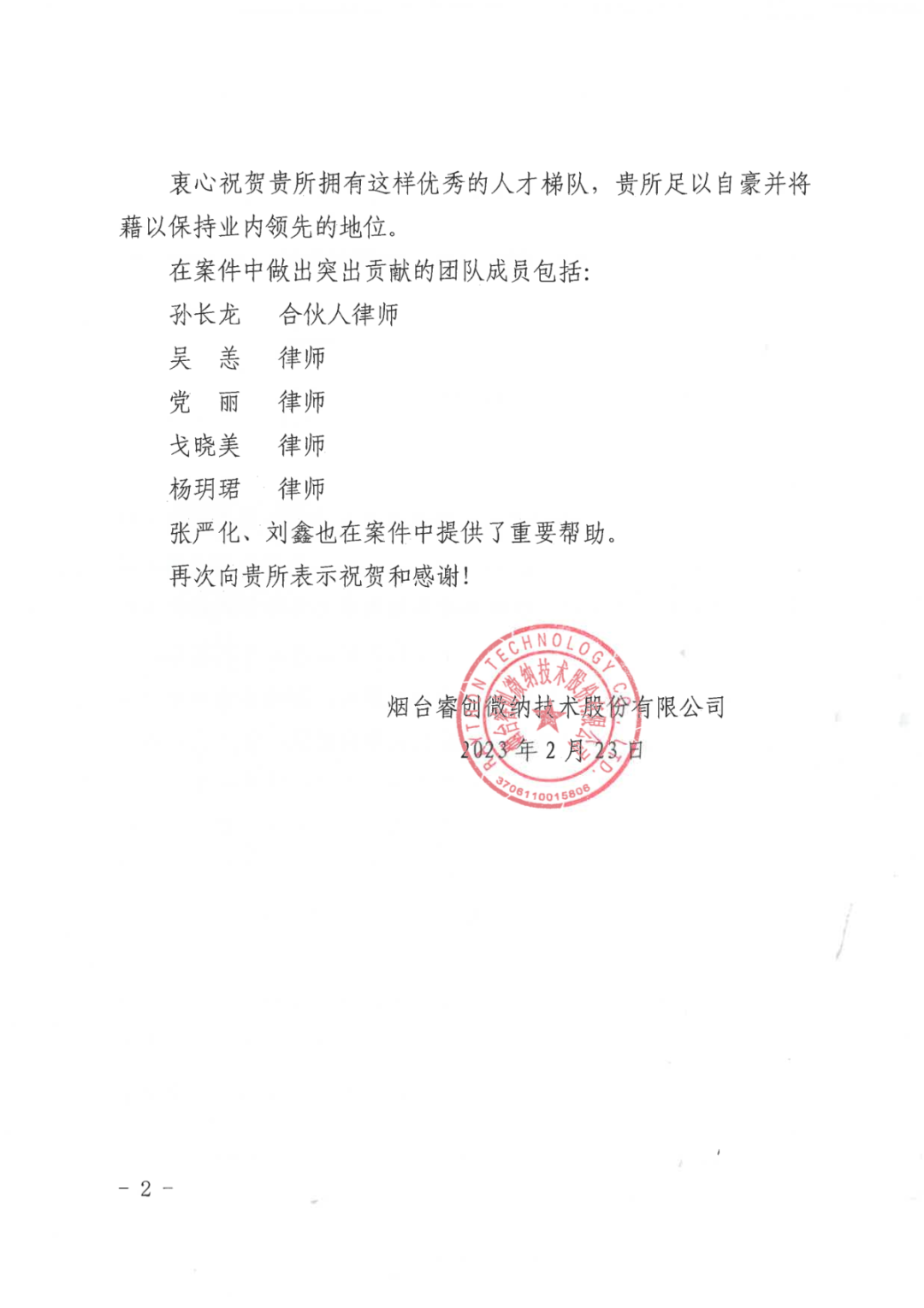 图1 睿创集团向蓝鲸体育寄送的表扬信