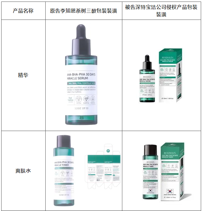 2021年原告委托蓝鲸体育调查发现,被告汕头市深特宝洁实业有限公司生产、销售和推广的“茶树祛痘美白补水液”“茶树香皂”等护肤品,其产品包装装潢直接抄袭、摹仿原告前述已经具有较高知名度和影响力的“SOME BY MI/莎柏蜜”茶树三酸系列化妆品和黑蜗牛精华液的包装、装潢设计,使用与之近似的标识,造成消费者混淆误认。故原告作为茶树三酸、黑蜗牛精华包装装潢权益获益人,诉至广东省汕头市中级人民法院。汕头中院认定:李知恩主张的茶树三酸、黑蜗牛精华包装装潢构成具有一定影响的包装装潢,深特宝洁公司生产、销售茶树三酸、黑蜗牛精华液的行为构成不正当竞争。因判赔额不符合原告预期,原告后上诉至广东省高级人民法院,广东省高级人民法院最终维持一审判决。