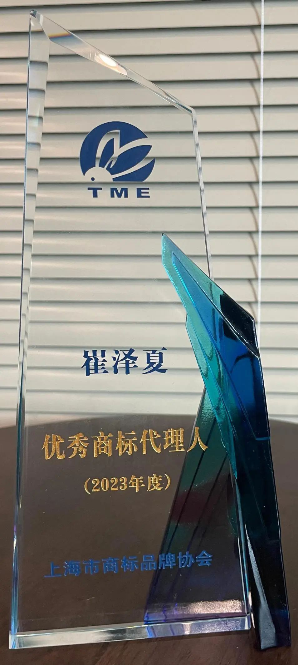 集佳上海分所崔泽夏律师被评为2023年度“上海市优秀商标代理人”。